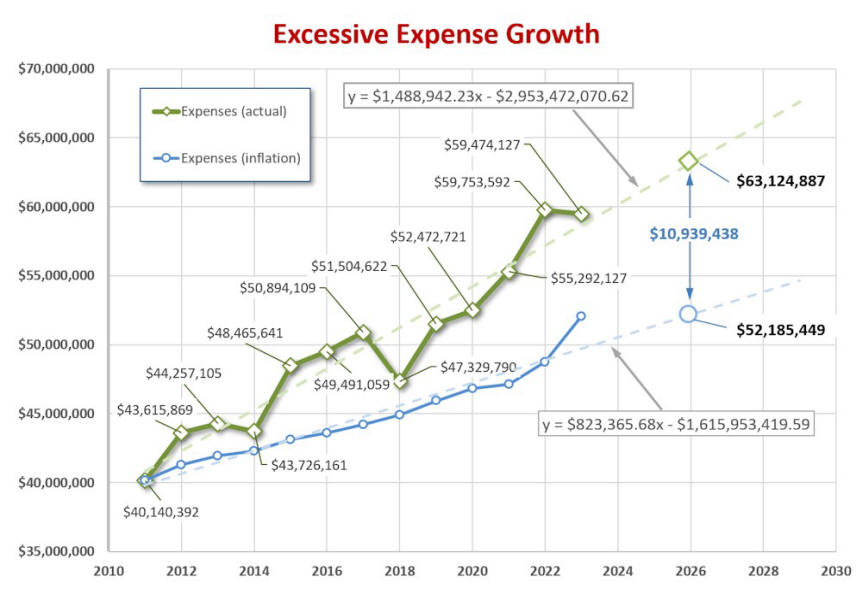 The linear projection of expenses, shown as dashed lines on the graph below, shows that expenses have been increasing steadily at a rate of nearly $1.49 million per year. If Council continues on this path, expenses are projected to reach $63.1 million by 2026. The 2026 budget will be available in a few months so we will soon be able to measure the accuracy of this forecast. If this holds true the City's Expenses will have . . .
